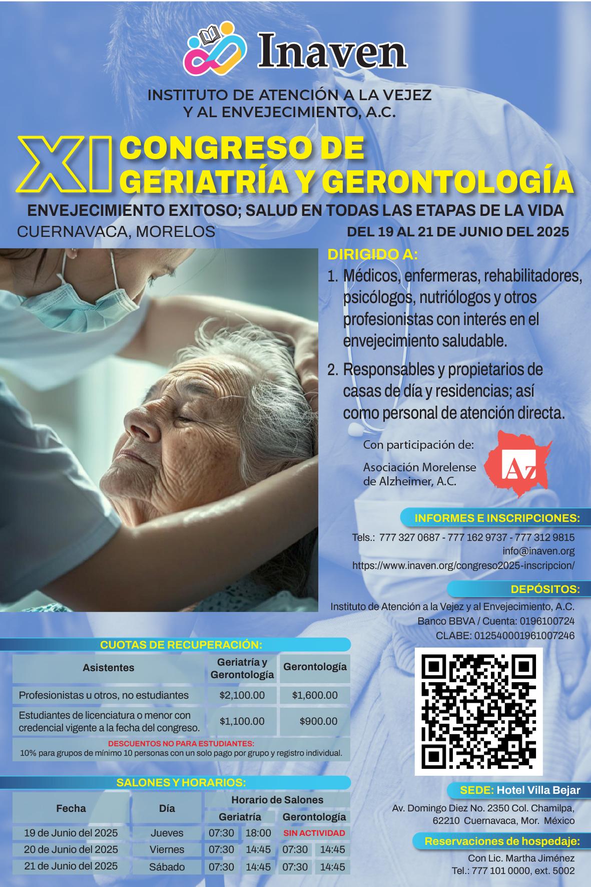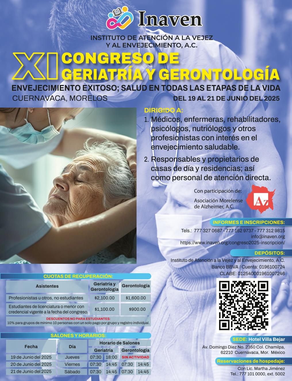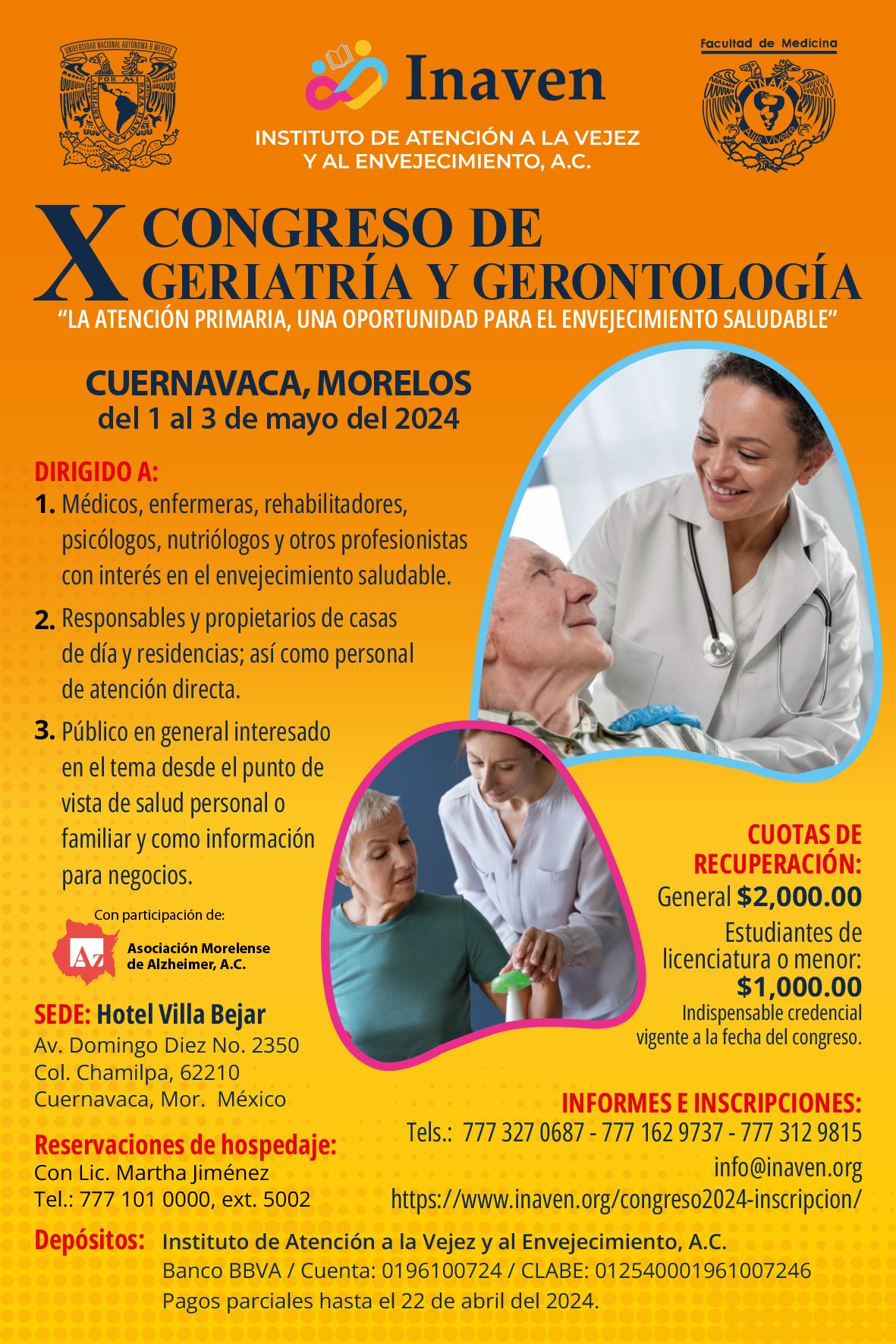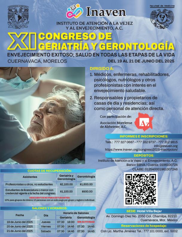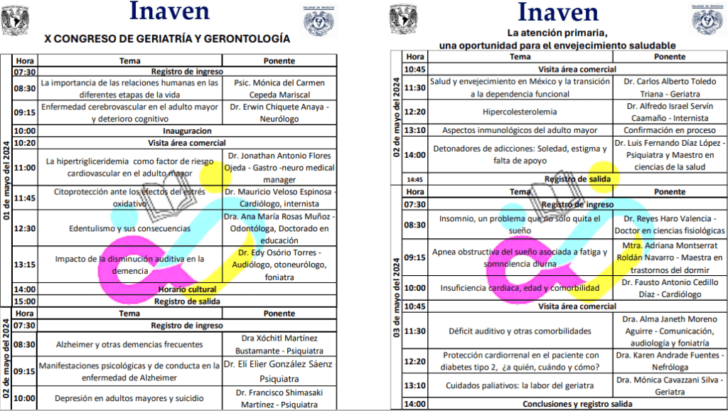 Por lo anterior, desde el año 2010 Inaven ha realizado anualmente (salvo algunos años en que por las circunstancias del entorno no se ha realizado) un Congreso de Geriatría y Gerontología, que ha contado con dos salones para personal profesional del Sector Salud y un salón especial para adultos mayores, sus familias y público en general interesado en el tema.